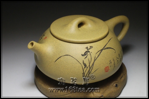 【壶语】:作者精选原矿段泥手工制作而成的石瓢壶色泽明朗,造型端庄稳重,敦实调和,一种大气凛然的君子风范油然而生,亦将经典之作制作得如此传神。壶的体形是以两条抛物线结合而成,一条是从口到底的转角处,一条是底中心至底的转角处。两条抛物线略有不同,壶把刚中有柔,和顺有劲。壶嘴直流有力,保证了通畅的出水效果。壶身装饰刻绘一株兰花,生于幽涧青石间,曼妙生姿,清雅幽然,清逸芳香,空谷幽兰,能白更兼黄,无人亦自芳;寸心原不大,容得许多香!